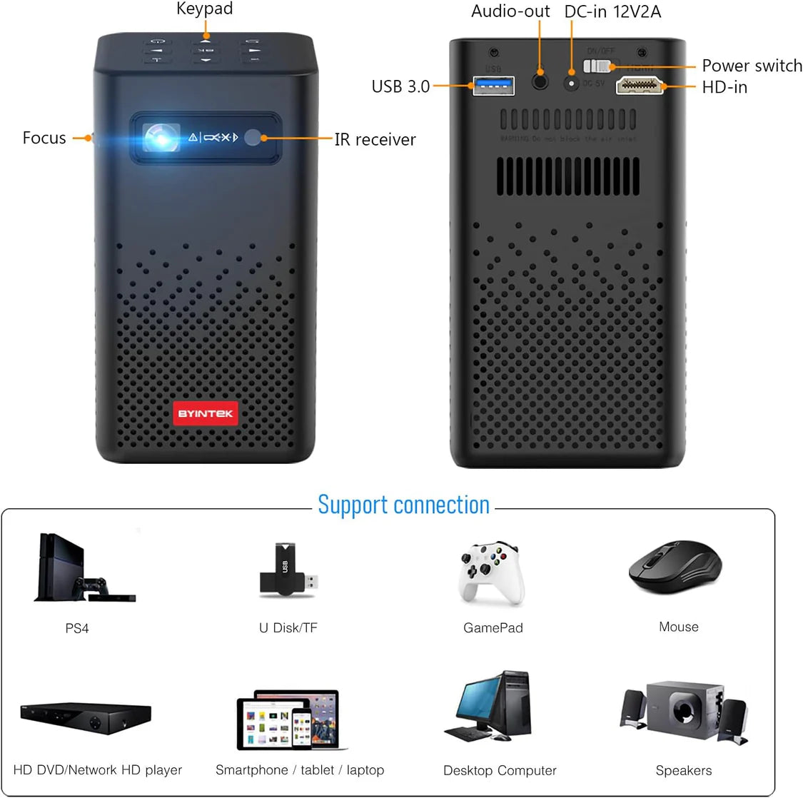 Support 1080P 4K video comes with caring case. Built-in 7800mAh rechargeable battery, Perfect for outdoor entertainment without restricting the power cord.